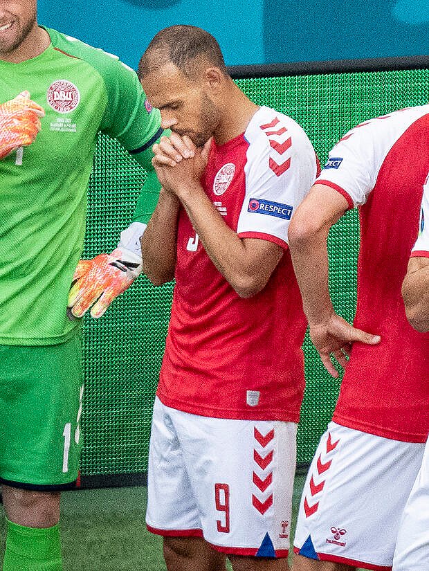 Eriksen's danish teammate martin braithwaite appeared to be praying, while goalkeeper kasper schmeichel also appeared to be gravely concerned.